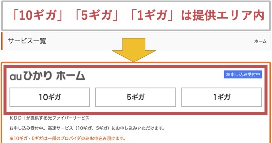 「auひかりホーム1ギガ」もしくは「10ギガ」「5ギガ」と表示されれば提供エリア内です。