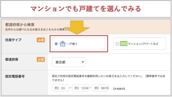 2. 「住居タイプ」で「マンション/アパートなど」を選び、都道府県を選ぶ