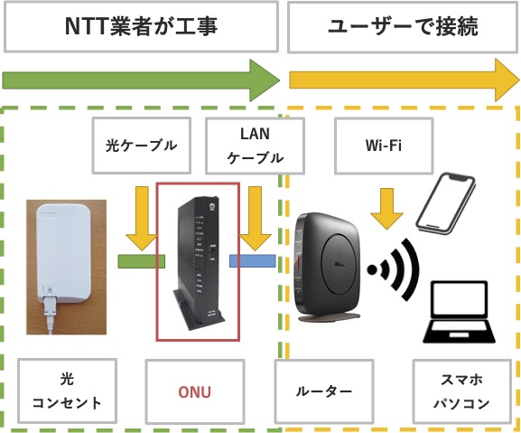 宅内では、ホームゲートウェイ(ONU)の設置し、ルーターとつなぎます。