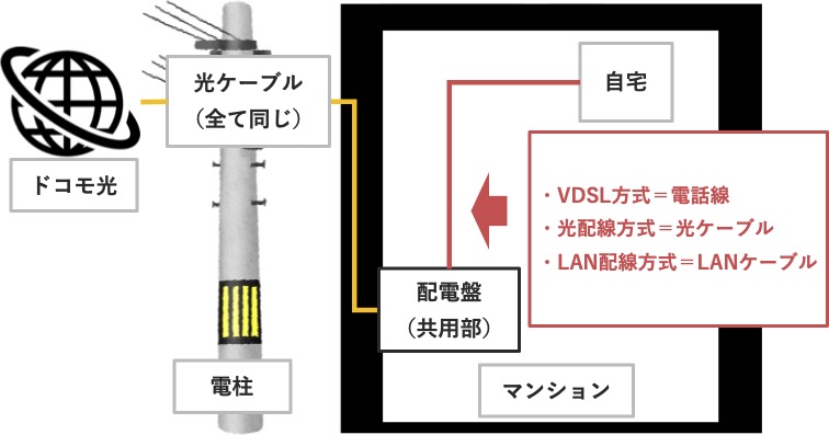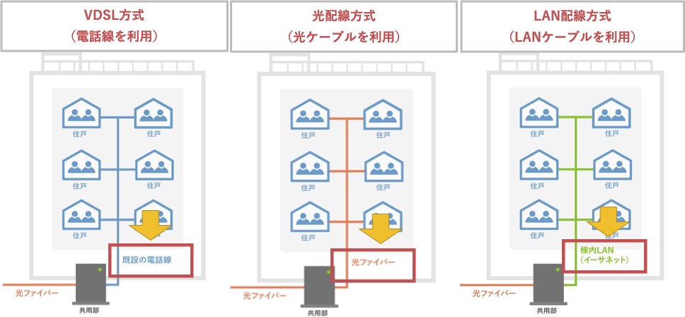 VDSL方式・光配線方式・LAN配線方式のちがいは「マンションの共用部から自宅までの配線のちがい」です。