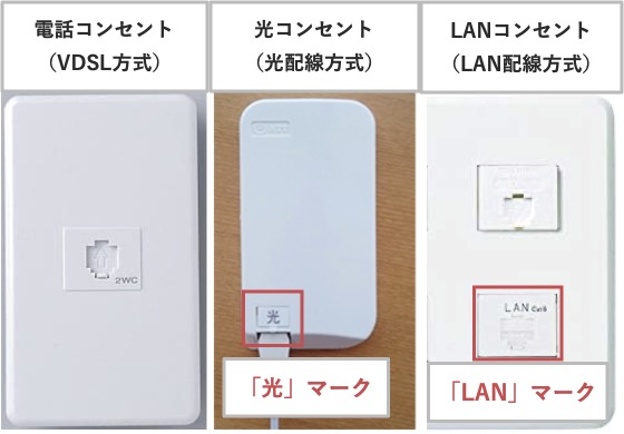 それぞれVDSL方式は「TEL(電話コンセント)」、光配線方式は「光コンセント」、LAN配線方式は「LANコンセント」が設置されています。