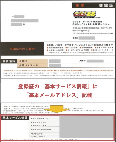 すでに申し込みが終わっている人は、契約時にもらった登録証の「基本サービス情報」にメールアドレスが記載されています。